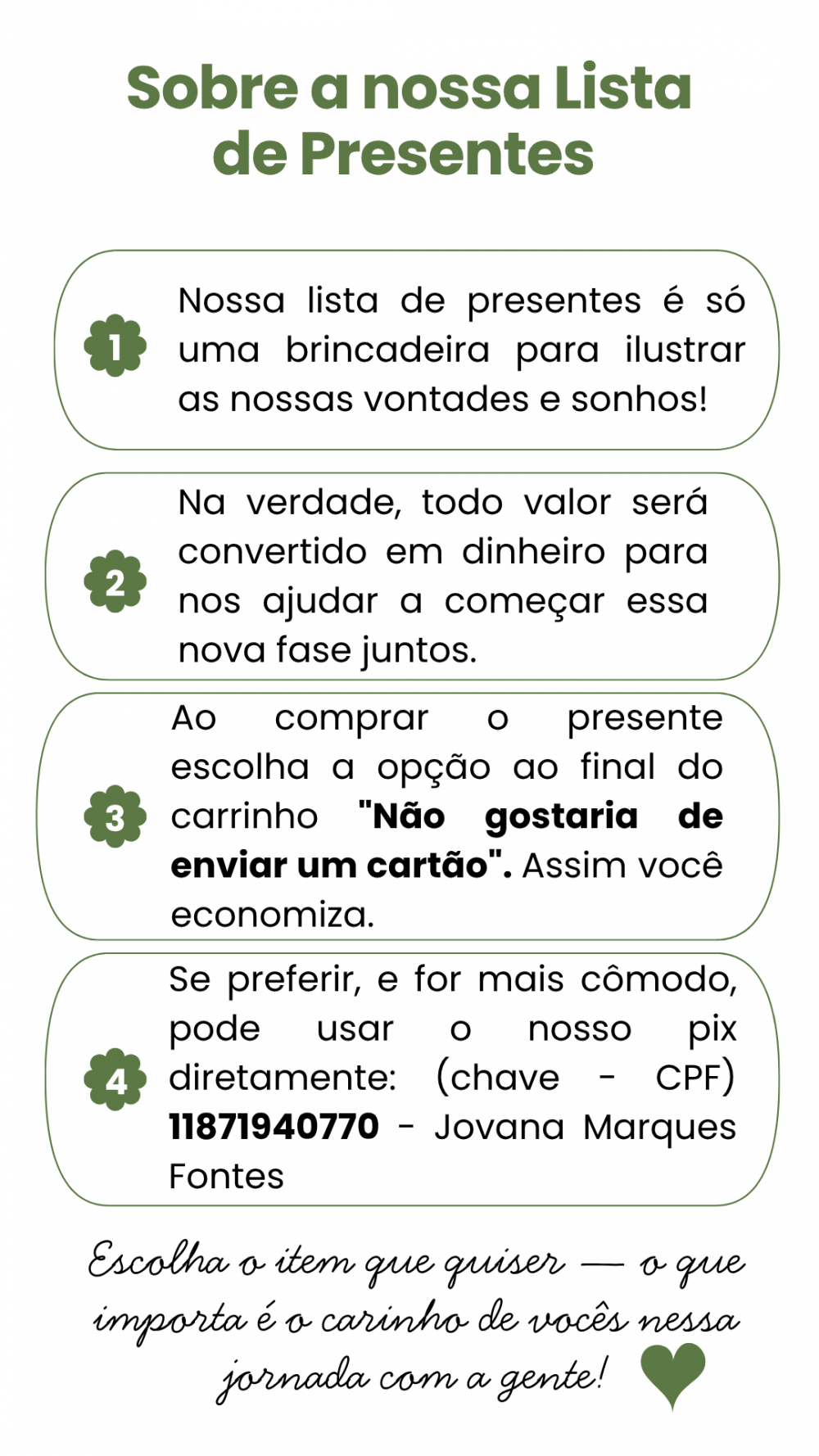 Para nos presentear, fique à vontade para escolher quaisquer dos itens da nossa Lista de Presentes... Aguardamos vocês.